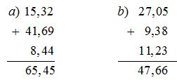a) \(15,32 + 41,69 + 8,44\); b) \(27,05 + 9,38 + 11,23\).