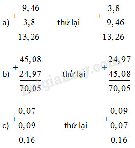 Thực hiện phép cộng rồi dùng tính chất giao hoán để thử lại: