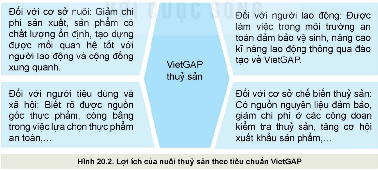 Nuôi thủy sản theo tiêu chuẩn VietGAP (Hình 20.1) mang lại lợi ích gì? Quy trình nuôi thủy sản VietGAP khác với nuôi thủy sản thông thường như thế nào?