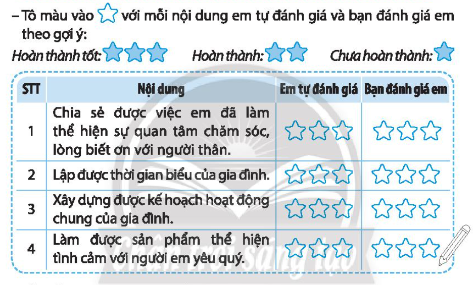 - Đầu tiên em đọc nội dung của bảng đánh giá, thông qua những lần tham gia hoạt động, em thấy mình đã hoàn thành tốt những yêu cầu của bảng đưa ra chưa? Tự mình đánh giá mức độ hoàn thành của bản thân. Sau đó, em nhờ bạn đánh giá thông qua những ghi chép của em trong VBT và tô màu vào bảng.