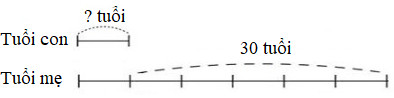 - Vì mỗi năm mỗi người tăng thêm 1 tuổi nên hiệu số tuổi không thay đổi. Hiện nay mẹ hơn con \(30\) tuổi thì cách đây \(3\) năm mẹ vẫn hơn con \(30\) tuổi . Từ đây ta đưa được về bài toán dạng tìm hai số khi biết hiệu và tỉ số của hai số. Ta vẽ sơ đồ biểu diễn tuổi con cách đây \(3\) năm là \(1\) phần, tuổi mẹ cách đây \(3\) năm là \(6\) phần. Coi số tuổi của con là số bé, số tuổi của mẹ là số lớn, ta tìm hai số theo công thức: