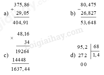 a) 375,86 + 29,05 b) 80,475 – 26,827 c) 48,16 x 34 d) 95,2 : 68