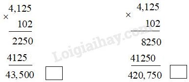 \(\begin{array}{*{20}{c}}{ \times \,\,\begin{array}{*{20}{c}}{\,4,125}\\{\,\,\,\,\,\,102}\end{array}}\\\hline{\,\,\,\,\,\,8\,2\,5\,0}\\{\,4\,12\,5\,0\,\,\,\,\,}\\\hline{420,750}\end{array}\)