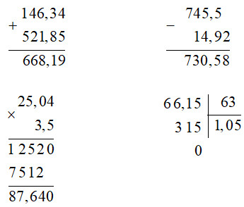 Đặt tính rồi tính theo các quy tắc đã học về phép cộng, trừ, nhân, chia số thập phân.