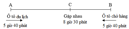 - Tính thời gian đi để gặp nhau ta lấy thời gian lúc gặp nhau trừ đi thời gian lúc hai ô tô xuất phát: $8$ giờ \(30\) phút $ - \,5$ giờ \(40\) phút và đổi kết quả vừa tìm được sang dạng số thập phân hoặc phân số có đơn vị là giờ.