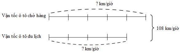 - Giải bài toán tìm hai số khi biết tổng và tỉ số của hai số. Theo đề bài, vận tốc ô tô du lịch bằng \(\dfrac{4}{5}\) vận tốc ô tô chở hàng nên ta vẽ sơ đồ biểu thị vận tốc ô tô du lịch gồm \(4\) phần bằng nhau, vận tốc ô tô chở hàng gồm 5 phần như thế. Để tìm hai số ta áp dụng công thức sau:
