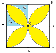 - Diện tích một cánh hoa bằng diện tích hình vuông \(AHOT\) trừ đi tổng diện tích hai phần \({S_1}\) và \({S_2}\).