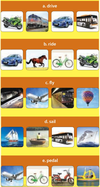 5. a. pedal: bicycle, motorbike, cydeboat; not airplane