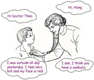 B: I was outside all day yesterday. I feel very hot and my face is red.