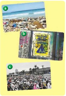 (Nhìn vào những bức tranh. Những vấn đề nào mà mỗi cộng đồng phải đối mặt? Viết a, b, c kế bên những từ trong bảng bên dưới.)