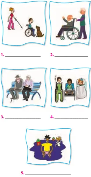Task 2. In pairs, take turns describing the people above. Your partner guesses which picture you are talking about. Then, discuss how you can help the people in these situations.