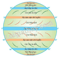 Hình 12.5. Các đai khí áp và các loại gió chính trên Trái Đất