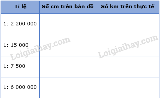 Hãy tính khoảng cách trên bản đồ và trên thực tế của các tờ bản đồ có tỉ lệ trong bảng sau: