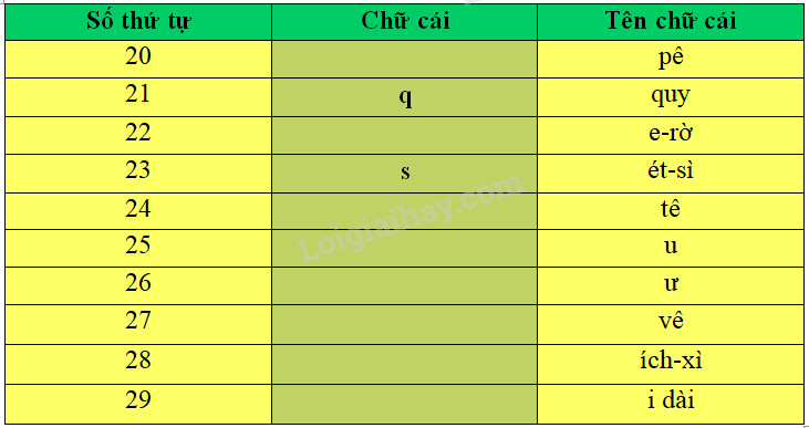 Em xem kĩ cách đọc tên ở cột thứ 3 rồi điền chữ cái tương ứng vào cột thứ 2.