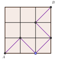 Quan sát hình dưới đây và chỉ ra ít nhất hai cách, để một con kiến bò từ A đến B theo đường chéo của các hình vuông nhỏ?