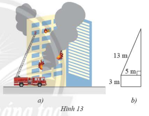 Cho biết thang của một xe máy cứu hỏa có chiều dài \(13\) m, chân thang cách mặt đất \(3\) m và cách tường của toàn nhà \(5\) m. Tính chiều cao mà thang có thể vươn tới.