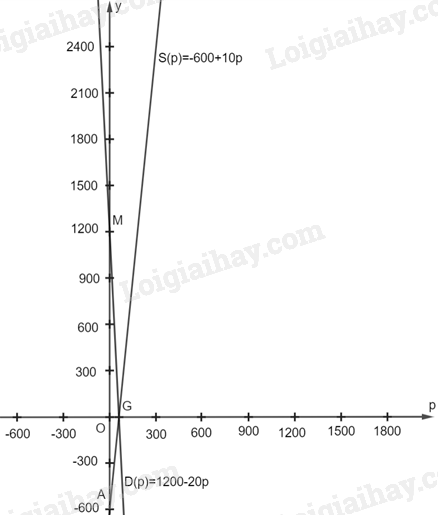 Đồ thị hàm số \(y = D\left( p \right) = 1\,200 - 20p\) đi qua \(M\left( {0;\;1\;200} \right),G\left( {60;0} \right)\)