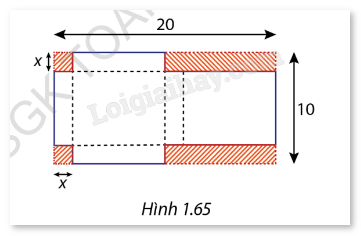 Từ một miếng bìa hình chữ nhật với kích thước 20cm x 10cm, bạn Lan cắt bỏ hai hình vuông có cạnh là x (cm) và hai hình chữ nhật (phần gạch sọc Hình 1.65) rồi gấp theo đường nét đứt và dán các mép để được một cái hộp có dạng hình hộp chữ nhật. Tìm x để thể tích hộp là lớn nhất và tính giá trị lớn nhất đó.