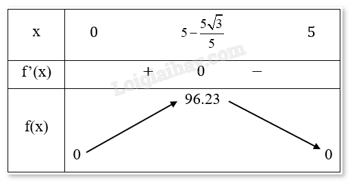 Vì miền xác định của 𝑥 là \(0 \le x \le 5\)nên chỉ nhận giá trị \(x = 5 - \frac{{5\sqrt 3 }}{5}\)