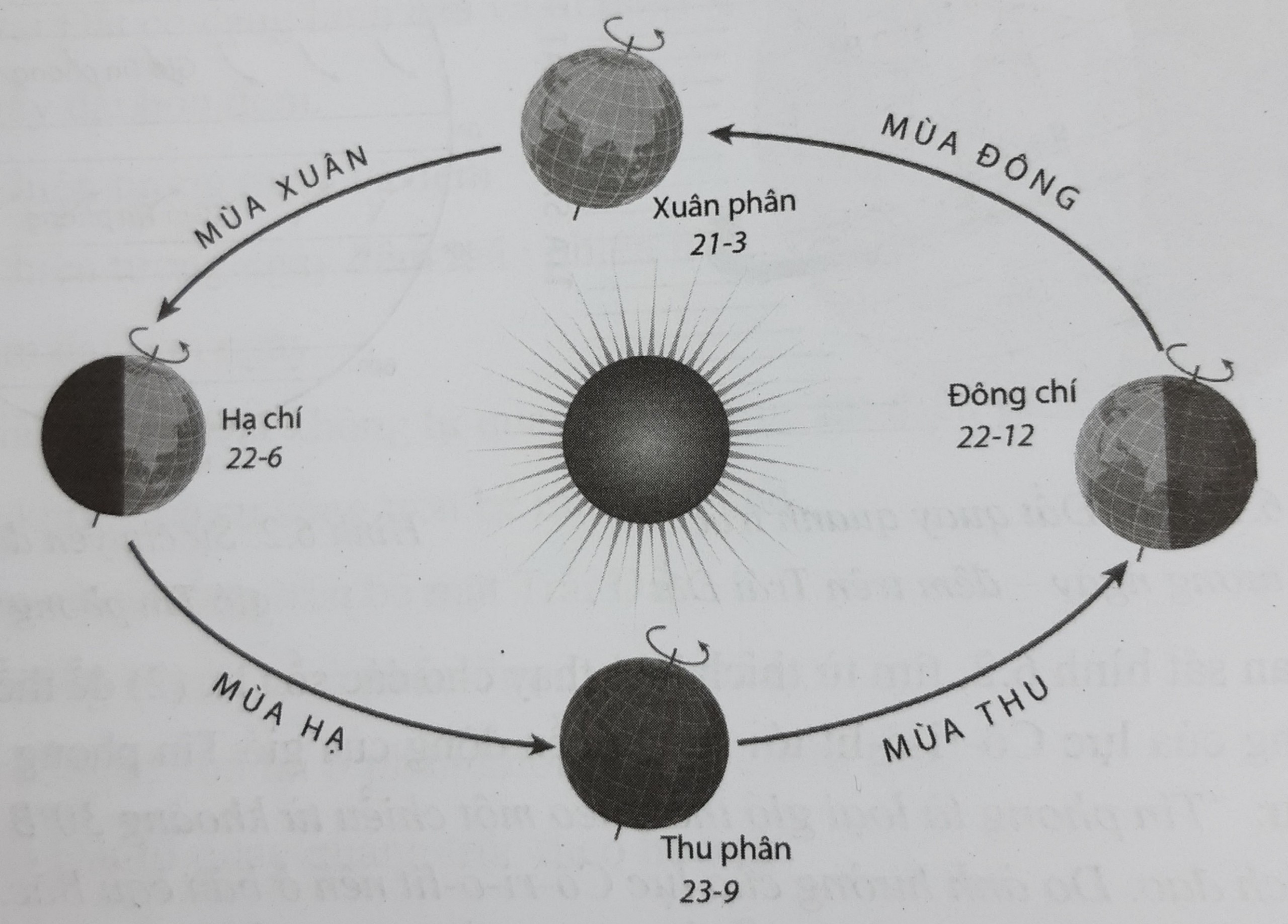 Hình 7.1. Sơ đồ chuyển động của Trái Đất quanh Mặt Trời và các mùa ở bán cầu Bắc
