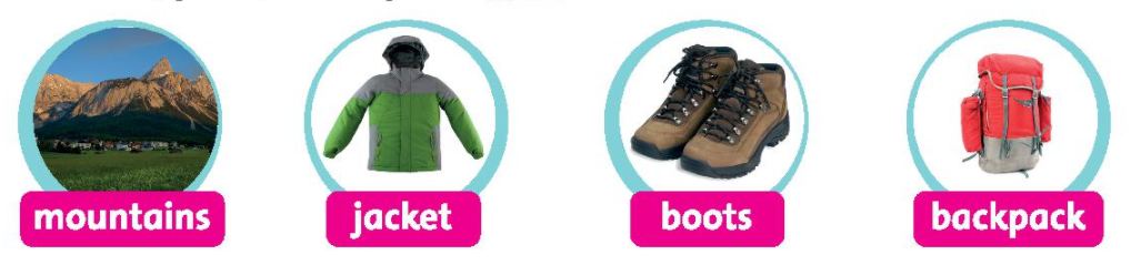 I wear a jacket and boots. I have a backpack. The mountains are beautiful!