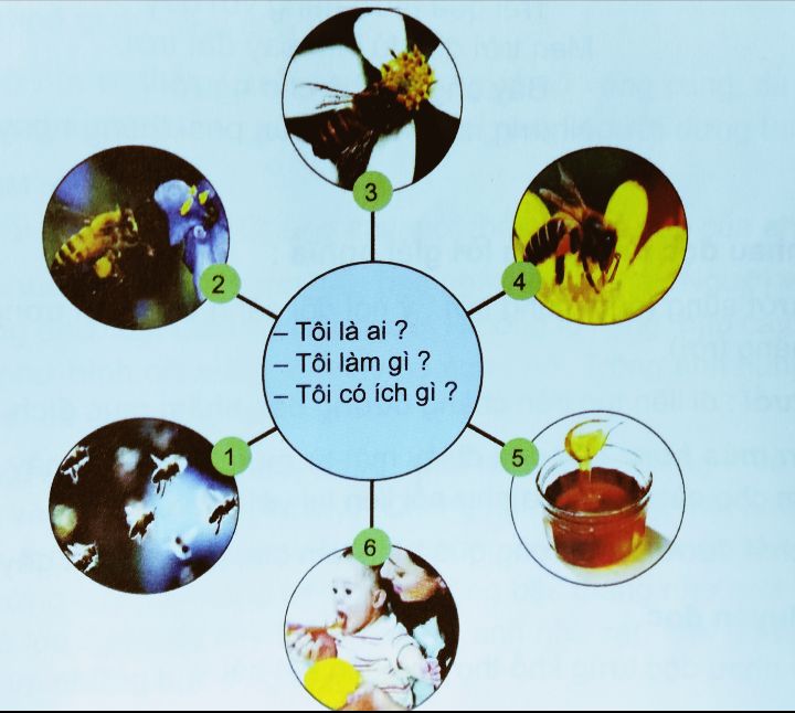 Dựa vào những bức ảnh bên dưới và các câu hỏi trong vòng tròn ở giữa sơ đồ, nói những điều em biết về loài ong.