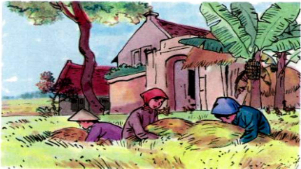 (2) ……: dùng trâu, bò kéo con lăn bằng đá để làm cho thóc rụng khỏi thân lúa.