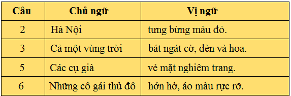 (2) Hà Nội tưng bừng màu đỏ. (3) Cả một vùng trời bát ngát cờ, đèn và hoa. (4) Những dòng người từ khắp các ngả tuôn về vườn hoa Ba Đình. (5) Các cụ già vẻ mặt nghiêm trang. (6) Những cô gái thủ đô hớn hở, áo màu rực rỡ.