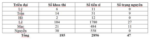 3) Triều đại có nhiều tiến sĩ nhất: Triều Lê – 1780 tiến sĩ.