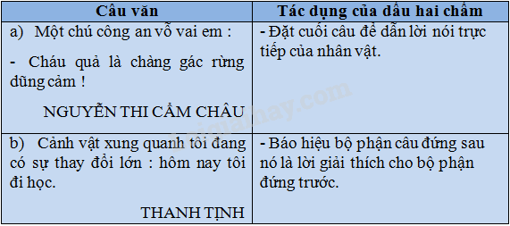 b) Viết vào vở tác dụng của dấu hai chấm trong mỗi trường hợp dưới đây: