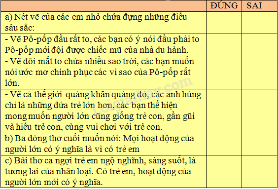 Từng tốp 3 học sinh nối tiếp nhau đọc 3 khổ thơ. Giọng đọc vui, cảm hứng ca ngợi trẻ em. Thể hiện đúng lời của phi công vũ trụ Pô-pốp: nhanh hơn, ngạc nhiên, thích thú lúc ngắm những bức tranh trẻ em vẽ mình; chậm lại từ câu Pô-pốp vừa xem vừa sung sướng mỉm cười; trầm hơn ở ba dòng kết.
