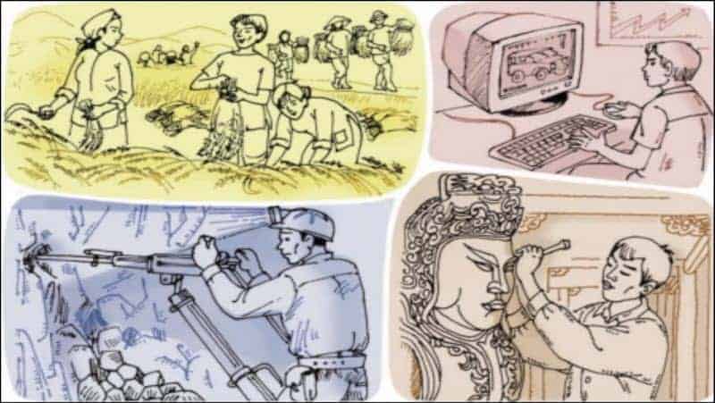- Bức tranh 4: Người thợ điêu khắc đang tạc tượng. Công việc của họ phục vụ cho đời sống văn hoá, tâm linh của con người,…