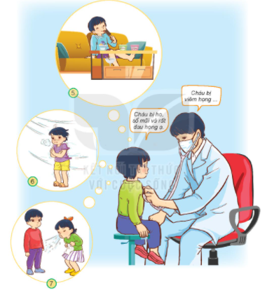 - Minh phải đi khám bệnh vì đau họng, sổ mũi và ho. Bác sĩ nói Minh bị viêm họng.