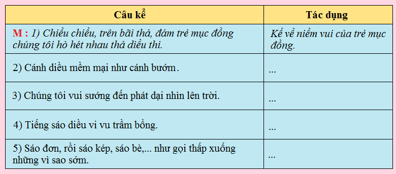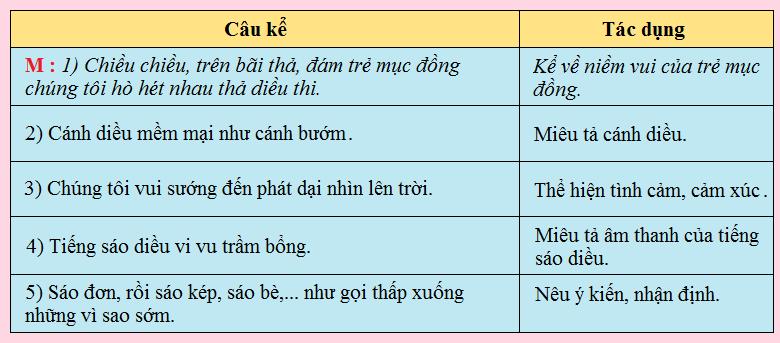 (1) Chiều chiều, trên bãi thả, đám trẻ mục đồng chúng tôi hò hét nhau thả diều thi. (2) Cánh diều mềm mại như cánh bướm. (3) Chúng tôi vui sướng đến phát dại nhìn lên trời. (4) Tiếng sáo diều vi vu trầm bổng. (5) Sáo đơn, rồi sáo kép, sáo bè,... như gọi thấp xuống những vì sao sớm.