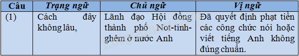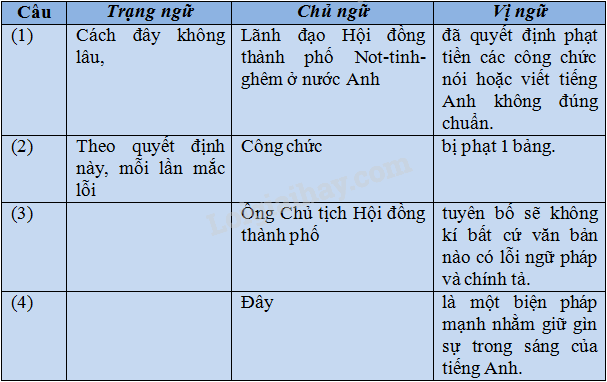 (1) Cách đây không lâu, lãnh đạo Hội đồng thành phố Nót-tinh-ghêm ở nước Anh đã quyết định phạt tiền các công chức nói hoặc viết tiếng Anh không đúng chuẩn. (2) Theo quyết định này, mỗi lần mắc lỗi, công chức bị phạt 1 bảng. (3) Ông Chủ tịch Hội đồng thành phố tuyên bố sẽ không kí bất cứ văn bản nào có lỗi ngữ pháp và chính tả. (4) Đây là một biện pháp mạnh nhằm giữ gìn sự trong sáng của tiếng Anh.