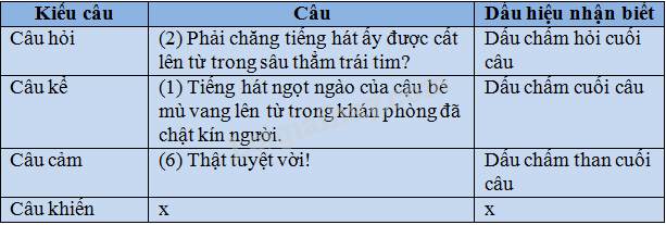 - Một câu kể: (1) Tiếng hát ngọt ngào của cậu bé mù vang lên từ trong khán phòng đã chật kín người.