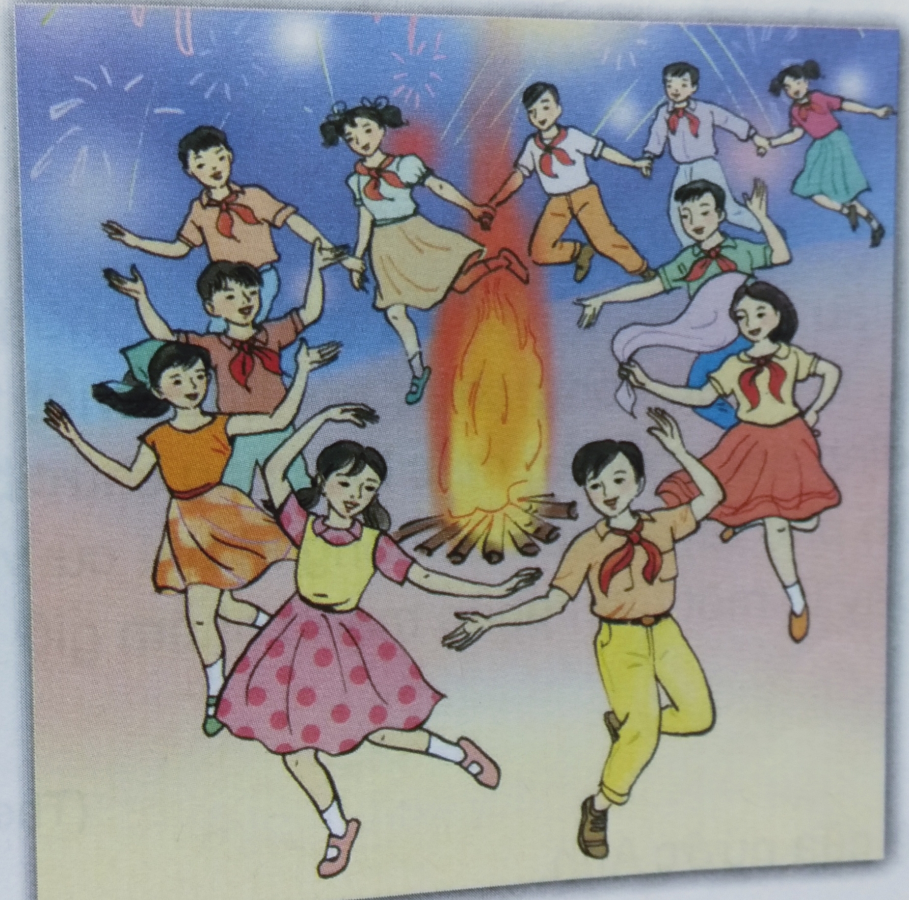 - Câu kể: Các bạn học sinh đang nhảy múa quanh đống lửa.