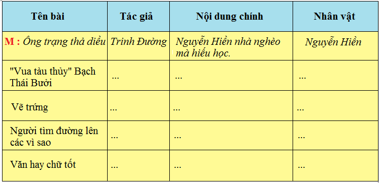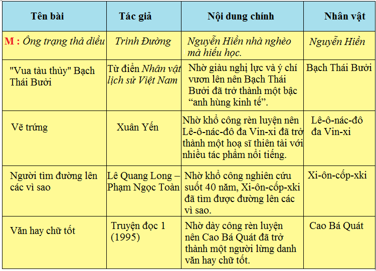 Lập bảng tổng kết các bài tập đọc là truyện kể trong chủ điểm Có chí thì nên trên bảng nhóm theo mẫu sau: