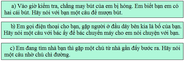 a) Hải ơi, bút của mình bị hỏng rồi, bạn làm ơn cho mình mượn chiếc bút của bạn đi!
