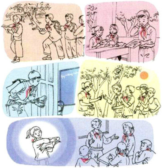 Tranh 3: Quốc hốt hoảng vì đến phiên mình trực nhật mà lại ngủ quên. Nhưng vào lớp đã thấy lớp sạch như lau, bàn ghế ngay ngắn. Thì ra lớp trưởng Vân đã làm giúp. Quốc thở phào nhẹ nhõm, biết ơn Vân.