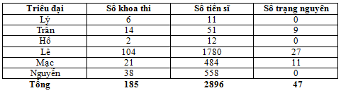 - Số khoa thi, số tiến sĩ và số trạng nguyên của từng triều đại được thống kê như sau: