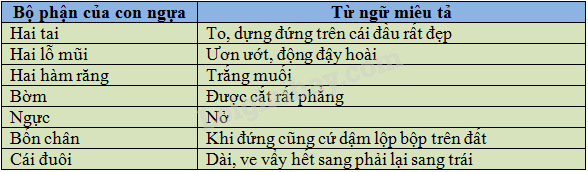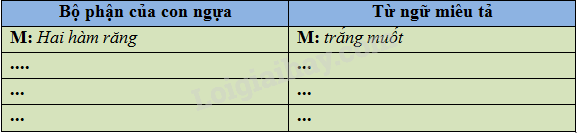 Tìm các bộ phận của con ngựa được tả trong đoạn văn trên và những từ ngữ tả mỗi bộ phận đó để điền vào phiếu học tập.