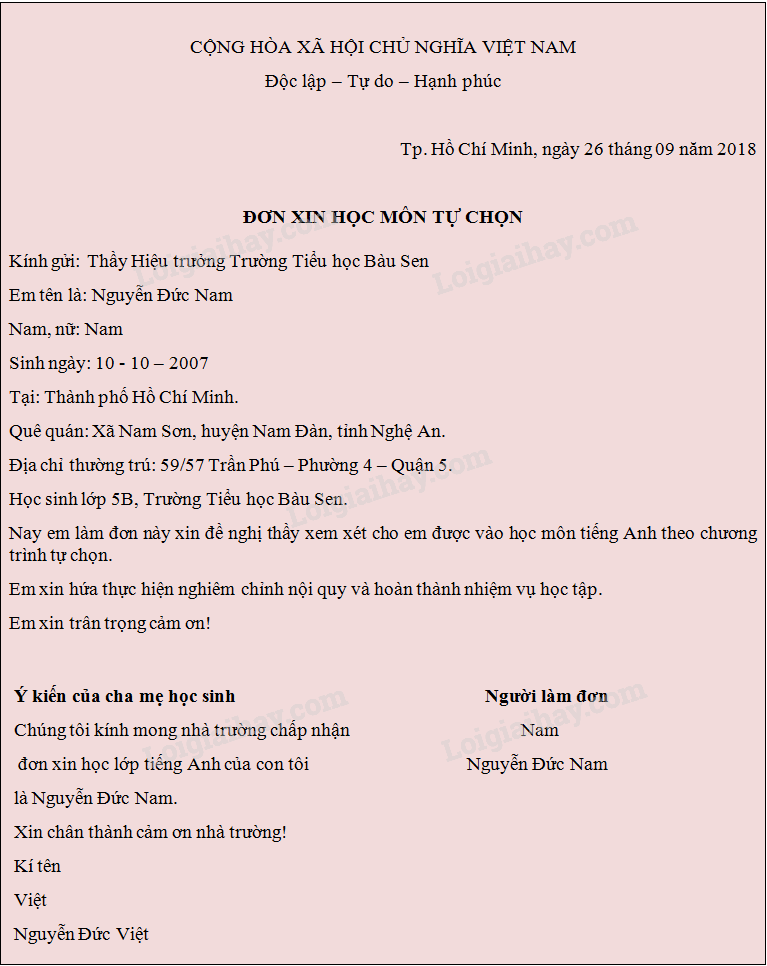 Đọc cho người thân nghe mẫu đơn xin học em vừa hoàn thành ở lớp.