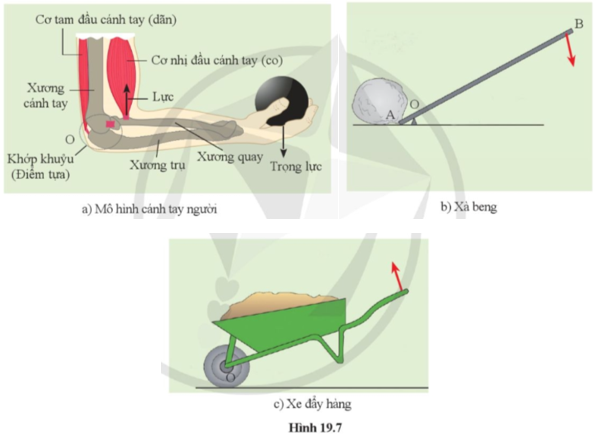 - Hình 19.7a: Đòn bẩy có điểm tựa ở một đầu, vật ở đầu bên kia và lực tác dụng ở trong khoảng giữa hai đầu.