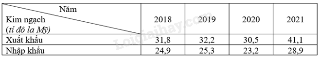 Kim ngạch xuất khẩu và nhập khẩu ở Việt Nam với các nước Đông Nam Á (đơn vị: tỉ đô la Mỹ) trong các năm 2018, 2019, 2020, 2021 lần lượt là: 31,8 và 24,9; 32,2 và 25,3; 30,5 và 23,2; 41,1 và 28,9.