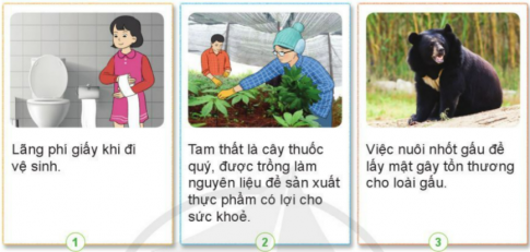 - Hình 1: Cách sử dụng giấy vệ sinh của bạn nữ trong hình là sai vì bạn đang làm lãng phí giấy. Giấy được làm từ các loại cây gỗ mềm nên nếu bạn đó lãng phí giấy cũng chính là lãng phí nguồn tài nguyên từ thực vật.
