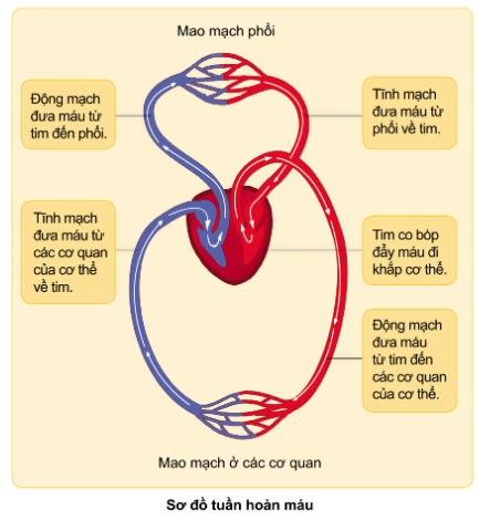 - Vòng tuần hoàn lớn: Đưa máu chứa nhiều khí ô-xi và chất dinh dưỡng từ tim đi nuôi cơ thể, đồng thời nhận khí các-bo-nic và các chất thải của các cơ quan rồi trở về tim.