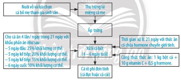 - Điều khiển giới tinh: hormone chuyển đổi giới tính được trộn vào thức ăn theo tỉ lệ phù hợp.