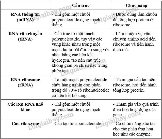 Phân biệt các loại RNA dựa vào cấu trúc và chức năng.