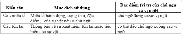 Nêu mục đích sử dụng và đặc điểm của câu miêu tả và câu tồn tại. Mỗi kiểu câu cho một ví dụ.